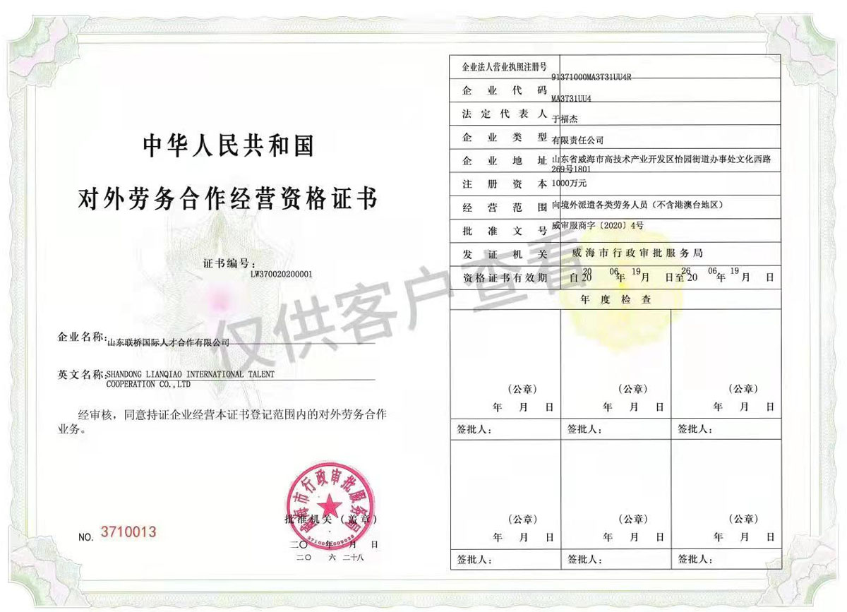 公司1997年獲得中國商務部對外勞務合作經(jīng)營資質,2000年獲得中國教育部首批外派留學中介服務資質。20多年來,公司秉承“責任、感恩”的核心價值觀,全體聯(lián)橋人團結拼搏,開拓創(chuàng)新,人才派遣事業(yè)得到了穩(wěn)步發(fā)展,累計向日本、韓國、新加坡、新西蘭、澳大利亞、匈牙利、奧地利、瑞典、芬蘭等國家派遣各類海外工作人員40000余人,留學生近萬人。公司目前已發(fā)展成為中國對外勞務合作行業(yè)的領軍企業(yè),其中對日人才派遣規(guī)模已連續(xù)多年名列前茅。